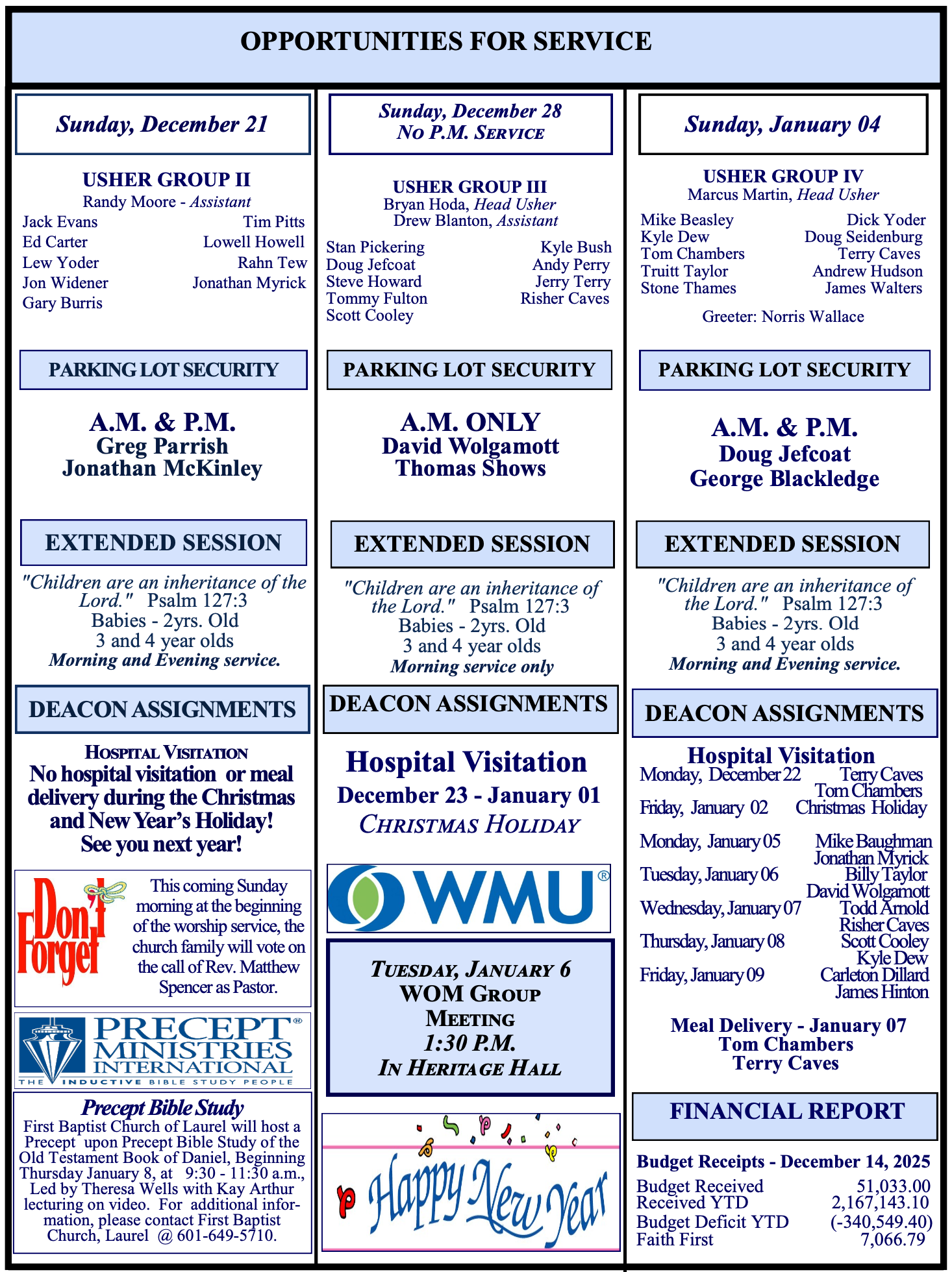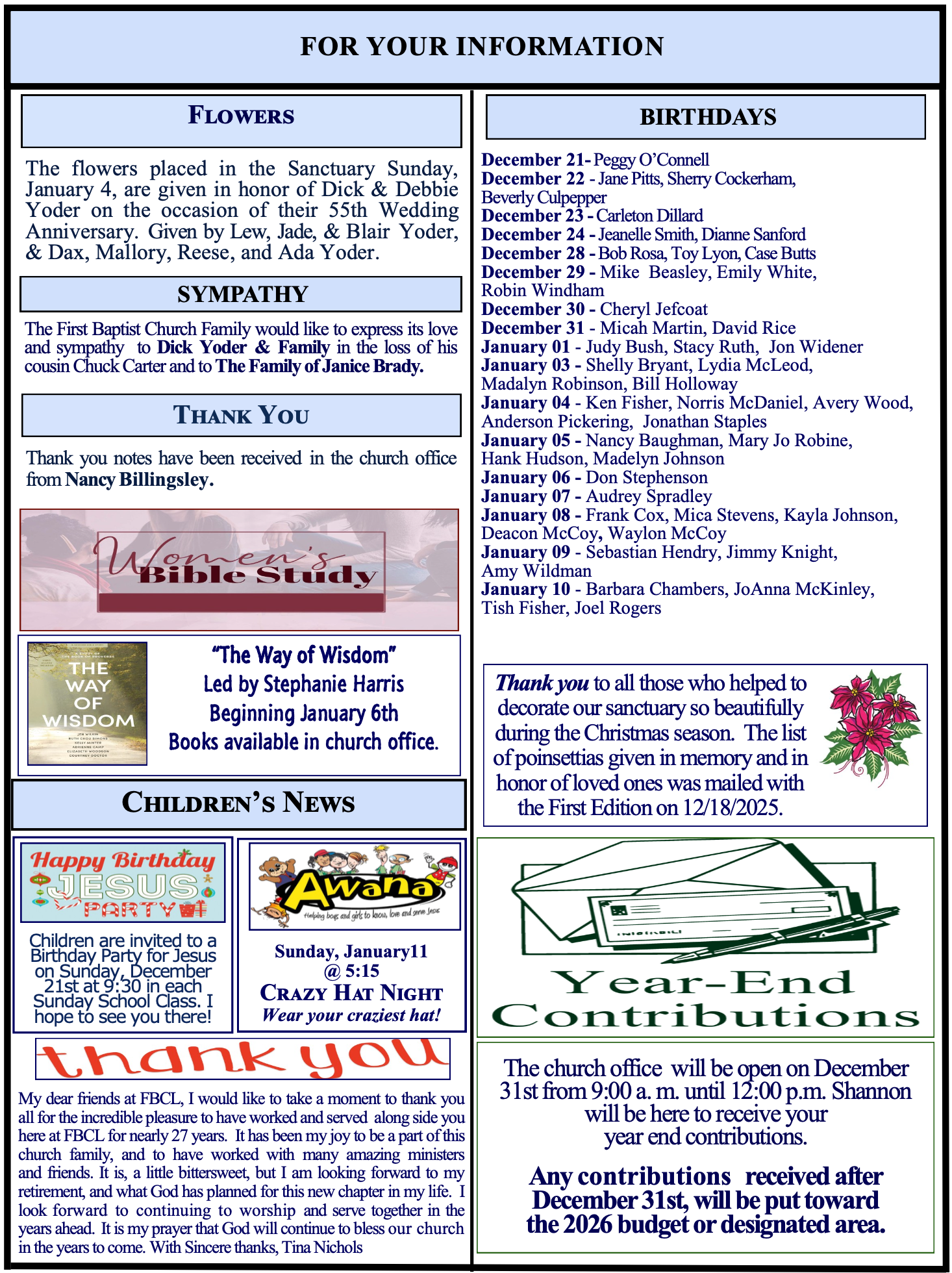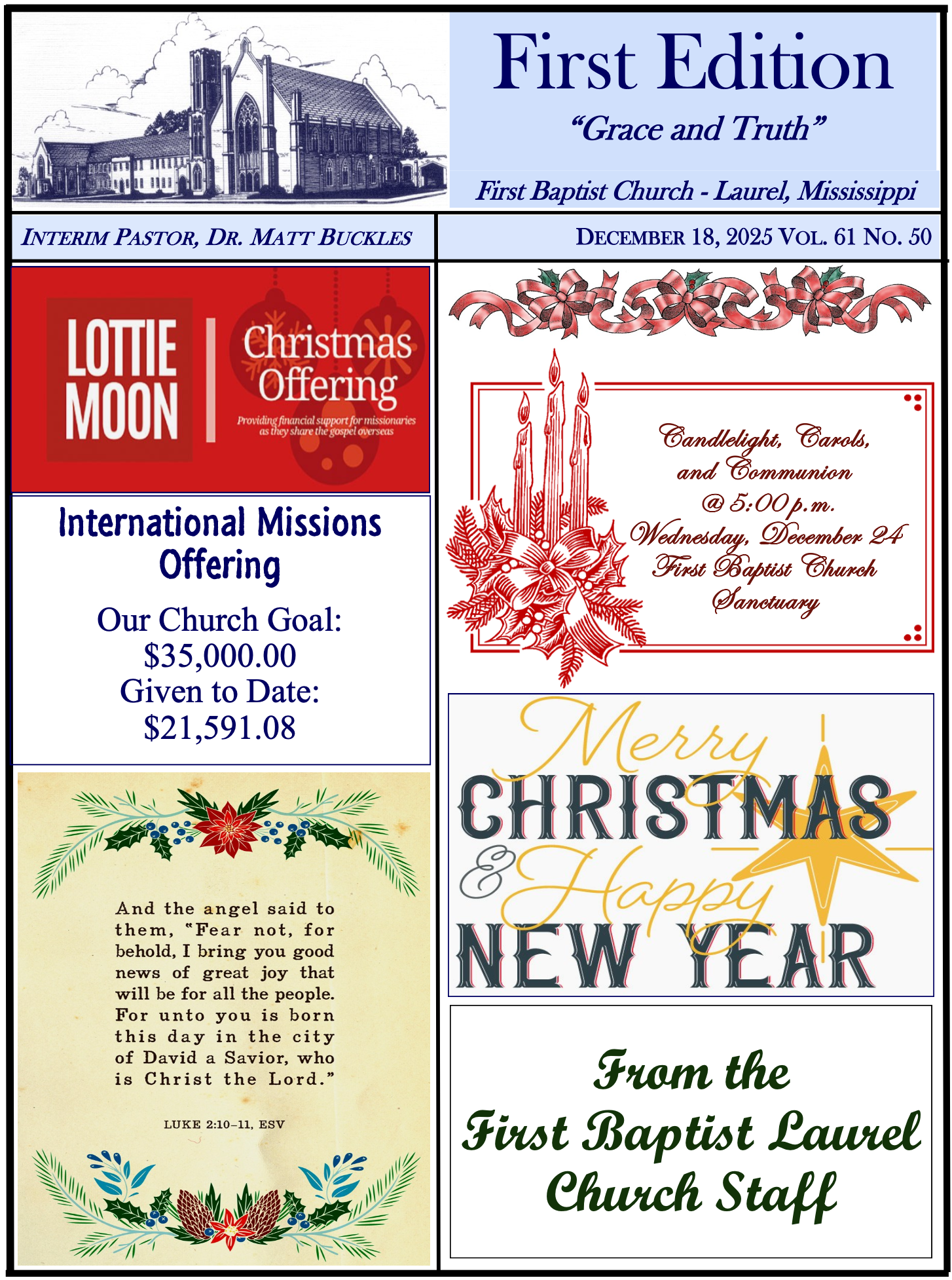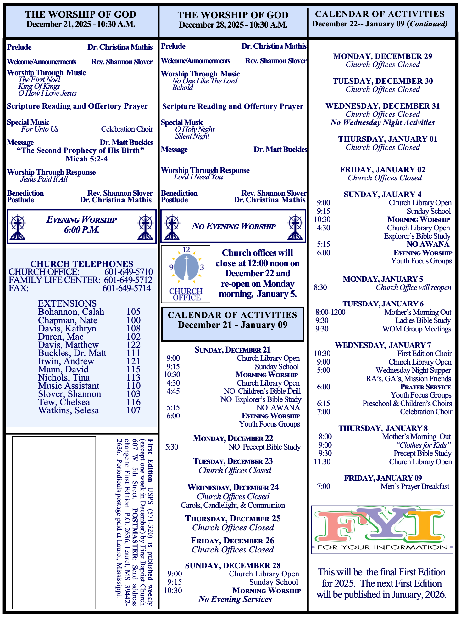 Facebook-f Search PLAN YOUR VISIT ABOUT US OUR STAFF THE PASTOR’S PEN HISTORY CONTACT MINISTRIES CHILDREN’S MINISTRY MUSIC MINISTRY YOUTH MINISTRY EDUCATION/SENIOR ADULT Women’s Ministry PASTORAL CARE MINISTRY SERVICES RESOURCES FIRST EDITION SERVICES HOW TO BECOME A CHRISTIAN CONTACT GIVE Menu PLAN YOUR VISIT ABOUT US OUR STAFF THE PASTOR’S PEN HISTORY CONTACT MINISTRIES CHILDREN’S MINISTRY MUSIC MINISTRY YOUTH MINISTRY EDUCATION/SENIOR ADULT Women’s Ministry PASTORAL CARE MINISTRY SERVICES RESOURCES FIRST EDITION SERVICES HOW TO BECOME A CHRISTIAN CONTACT GIVE Join Us for Worship This Sunday10:30 AM AND 6:00 PM Worship services 9:30 am Sanctuary Sunday School ACTS CH. 95 | FACEBOOK LIVE | FM 99.3 PLAN YOUR VISITWELCOMEConnecting and serving together to grow the kingdom is our passion. COME JOIN US.CONNECT WITH USFIRST THINGS FIRSTBut seek first His kingdom and His righteousness, and all these things will be added to you.Matthew 6:33PLAN OF SALVATION Previous Next Check out what's happening at FBC FIRST EDITION - December 18, 2025 - VOL. 61 NO. 50 PAGE 1 PAGE 2 PAGE 3 PAGE 4